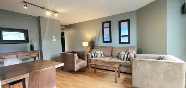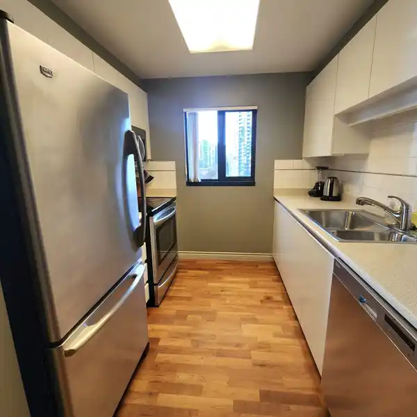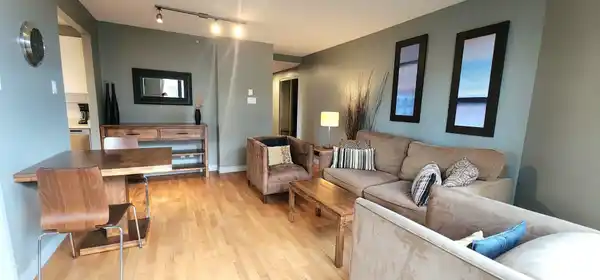 Located at Citycrest in the heart of Yaletown (1155 Homer & Davie), this well-appointed 1 Bed + Den home is just one block to the SkyTrain and steps to the area’s best restaurants and shops. Offering approximately 700 sq ft, the suite features hardwood floors throughout and floor-to-ceiling windows that fill the space with natural light. Enjoy outlooks over Davie Street, with a park next door and partial views of False Creek. Thoughtfully furnished with a queen bed in the bedroom, a high-quality sofa bed in the living room, and solid wood furnishings throughout. Citycrest offers excellent amenities including a fully equipped gym, lounge, meeting room, and a beautifully maintained central courtyard. Includes 1 parking stall, in-suite laundry, and all utilities with WiFi.