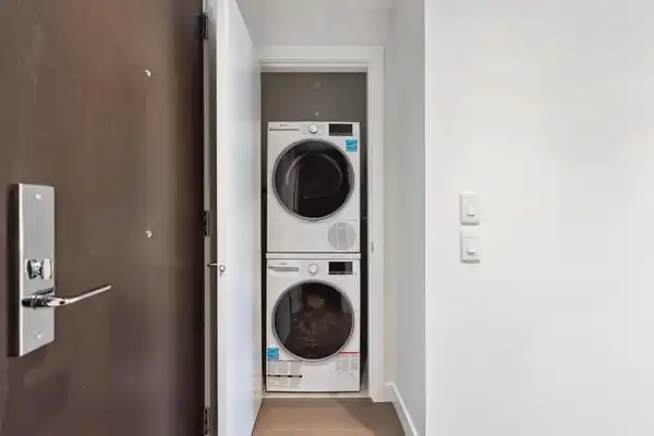 This newer, luxurious, 536sf, 1 bedroom + flex condo, has engineered wide-plank hardwood floors and central air conditioning & heating throughout. The efficient layout ensures there is no waste of space. At the entrance, there are the laundry closet to the left and the long flex room to the right. The rectangular living room has access to the covered balcony and high ceilings. The gourmet kitchen features Italian-imported cabinetry, under-cabinet LED lighting, quartz countertops, porcelain slab backsplash, kitchen island, undermount stainless steel sink, integrated fridge, a 4-burner gas cooktop, a speed oven and dishwasher. The bedroom has a large walk-in closet. Rent includes 1 parking stall and 1 storage locker.