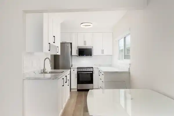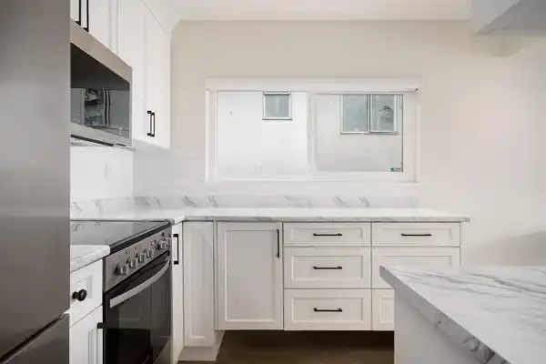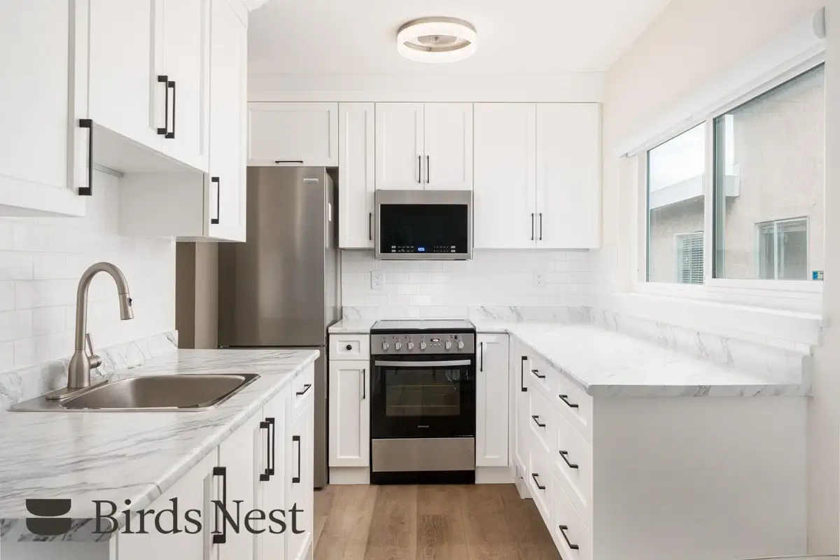 Welcome home to Larkin, situated in the highly sought-after South Granville area. This recently renovated condo features laminate flooring throughout, over-height ceilings, and ample amounts of natural light from the expansive windows, as well as South-facing views of the surrounding flora and fauna. Featuring plenty of cabinet and counter space, high-end stainless steel appliances, and space for a breakfast nook, this kitchen is perfect for an evening of socializing with friends and family. (Please note that there is no dishwasher). Enjoy access to a shared coin-op laundry room, storage locker, and an off-street parking stall. Nestled in the heart of Vancouver, South Granville is in a coveted area within walking distance of gorgeous parks and amazing shopping and dining options.