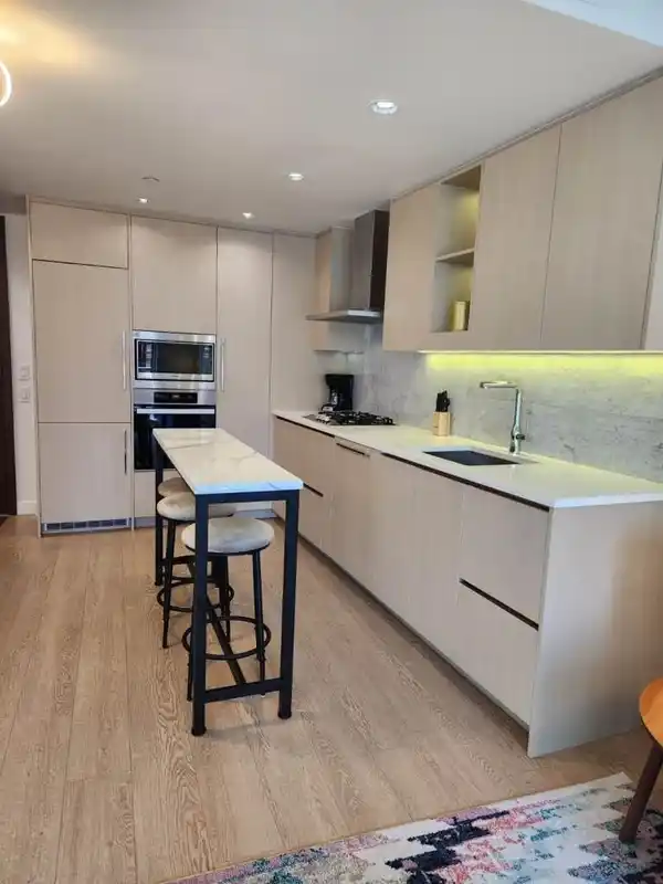 Discover a refined urban lifestyle in this furnished one-bedroom condo in Vancouver, offering 525 square feet of thoughtfully designed space. This entire floor suite combines modern luxury with practical convenience, ideal for those who appreciate elegance in a vibrant city setting. Step into a space where high ceilings and north-facing windows frame breathtaking city, mountain, and water views, creating a serene and inspiring atmosphere. The living area includes a versatile Murphy bed, optimizing space for both living and sleeping. The king-size master bedroom is a sanctuary of comfort, featuring a walk-in closet that offers ample storage.